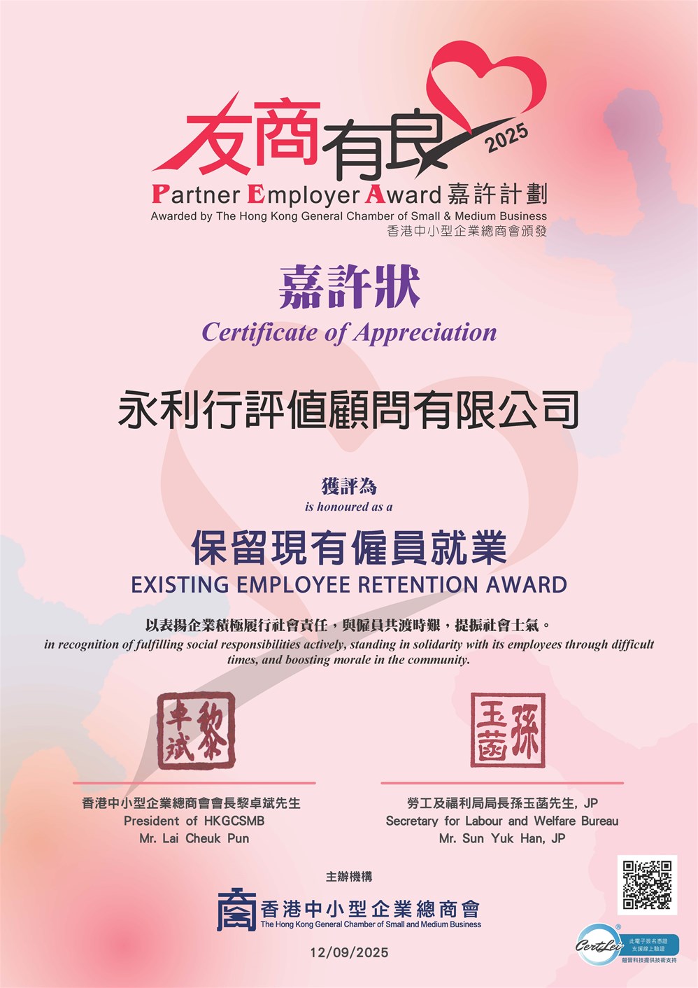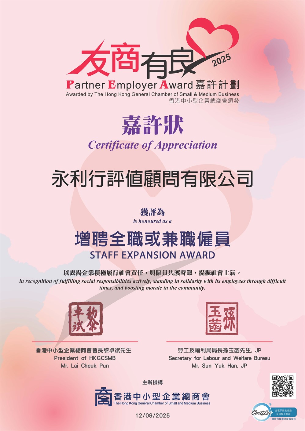 RHLAppraisal Limited is honored to announce that we have once again been awardedthe 10+ “Partner Employer Award” recognition by TheHong Kong General Chamber of Small and Medium Business in 2025.